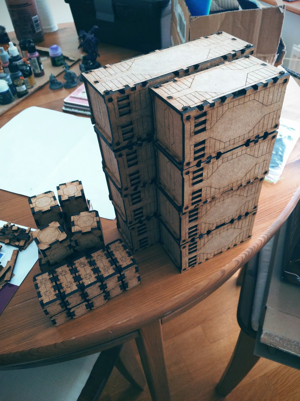 Once they had arrived I took a look at the components. It all seems pretty straight forward, the instructions are in some cases missing but lets be honest, if I can put my Malifaux miniatures together I can put a cube together. Popping the laser cut MDF pieces was a dream, nothing was miscut or got caught and half an hour later I had the bits out and separated ready to go. Armed with a huge pot of PVA glue and rubber bands I set about piecing these together. This is when I realised the sheer number of crates I had. It took me roughly 4 hours to get through the entire lot but by the end of it I had something that looks like the picture below. Awesome! I definitely recommend using elastic bands to hold the PVA together whilst it goes off, you want some solid terrain that can survive a beating.